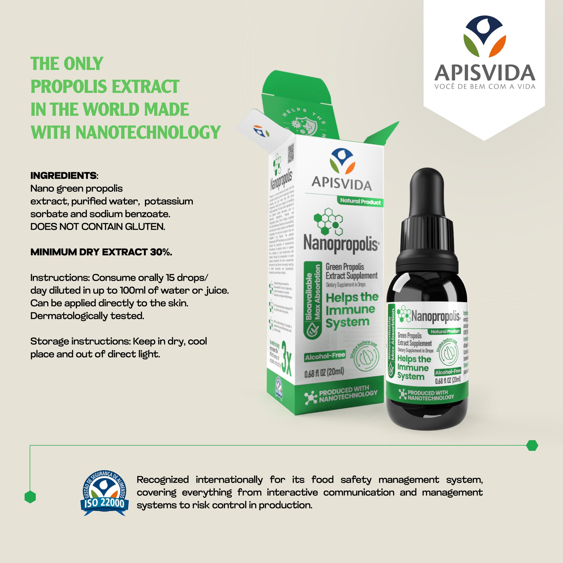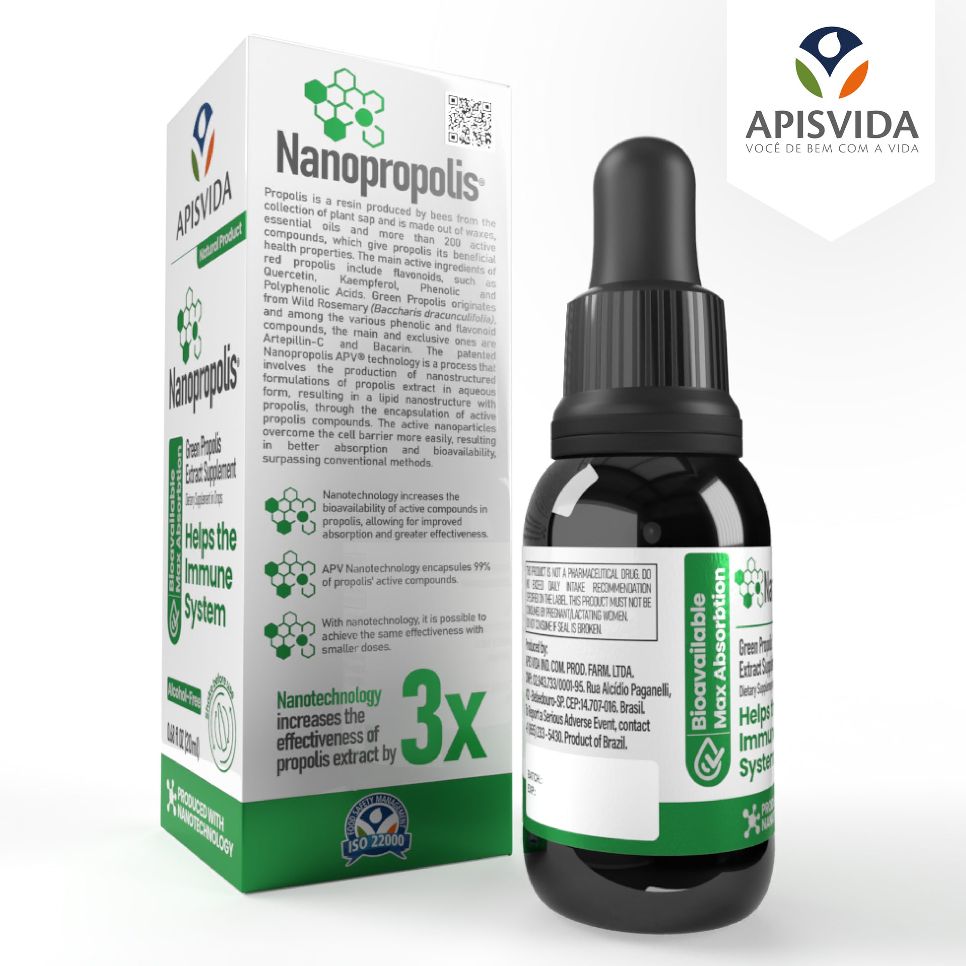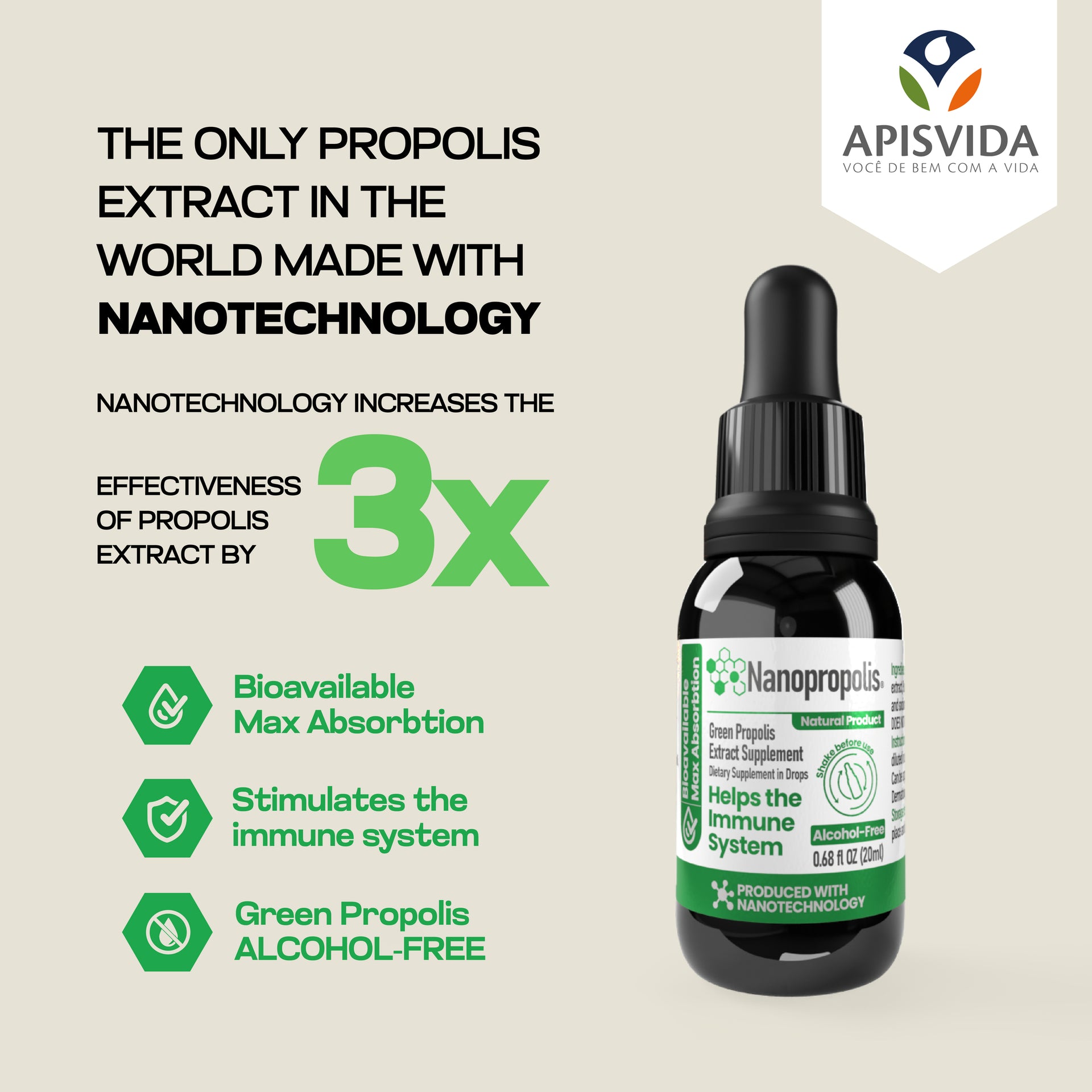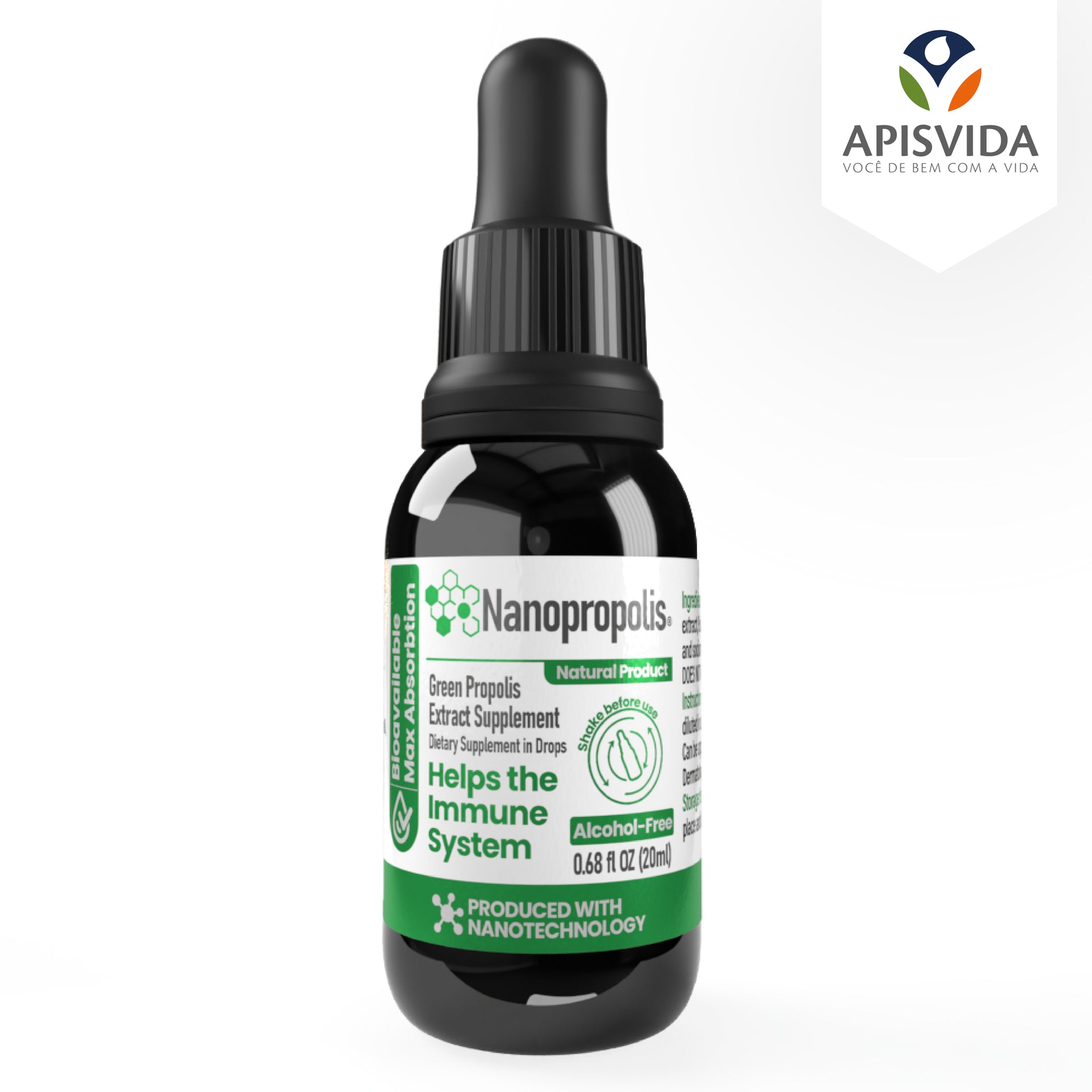 Nanopropolis is made with authentic Brazilian green propolis, formulated using advanced nanotechnology. This exclusive technology developed by ApisVida has increased the efficacy of the propolis extract by three times, thanks to lipid nano-structures that preserve 99% of the active ingredients in an alcohol-free product.