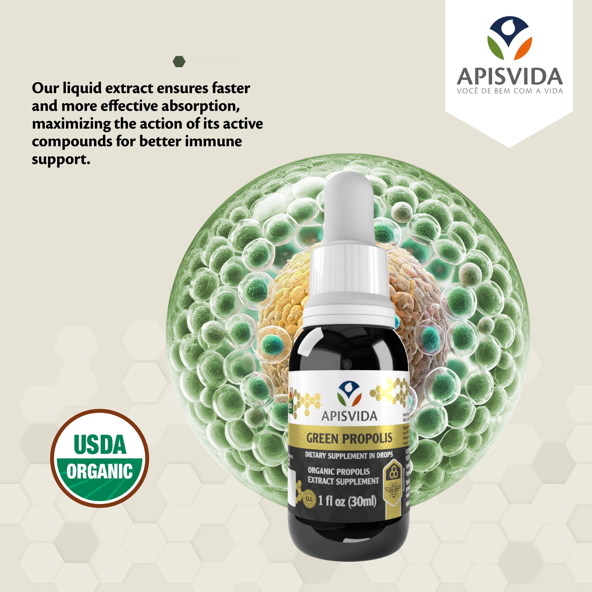 Ideal for promoting beneficial biological activities in the body, Organic Green Propolis Extract helps strengthen the immune system, supports tissue regeneration (healing action), and provides antioxidant properties that combat free radicals.